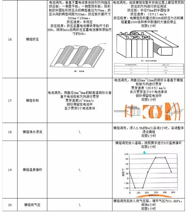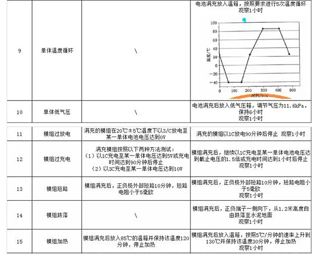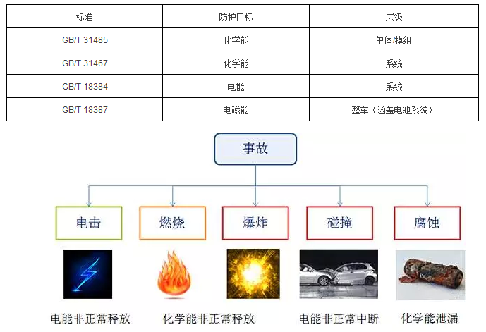 GB/T 31485-2015主要考核动力电池单体和模组的安全指标,围绕化学能的防护,给出了一系列滥用情况以及极端情况下的安全要求和检验规范。