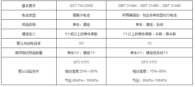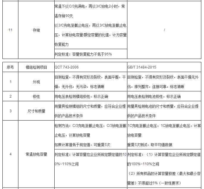 GB/T 31486-2015主要针对电池单体的外观、尺寸、重量和室温放电容量,以及模组的外观、尺寸、重量、常温性能、高低温性能、耐振动性能、存储等方面做出相应的规定。与QC/T 743相比,GB/T 31486-2015取消了针对单体电池的高低温性能、放电倍率性能、荷电保持与容量恢复能力、存储等方面的要求,但是增加了针对模组的常温充放电倍率性能、高低温性能、荷电保持与能量恢复能力等相关要求,具体内容的对比如下: