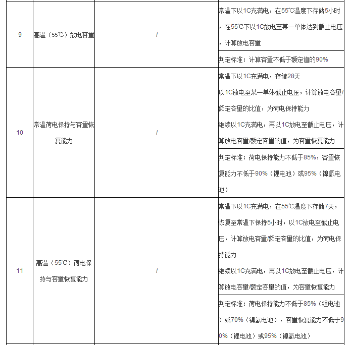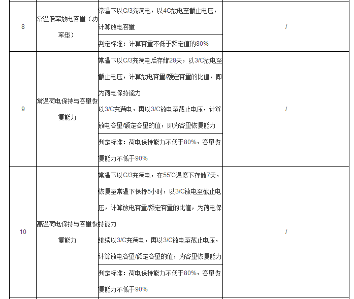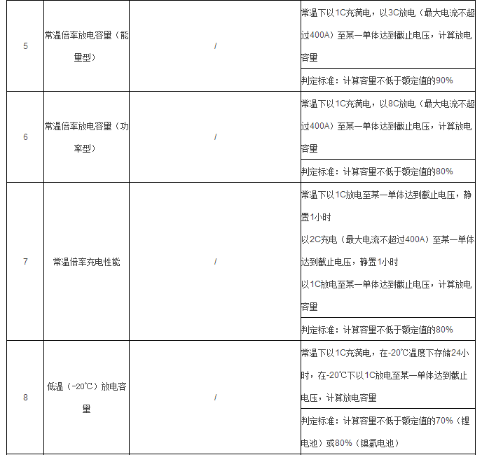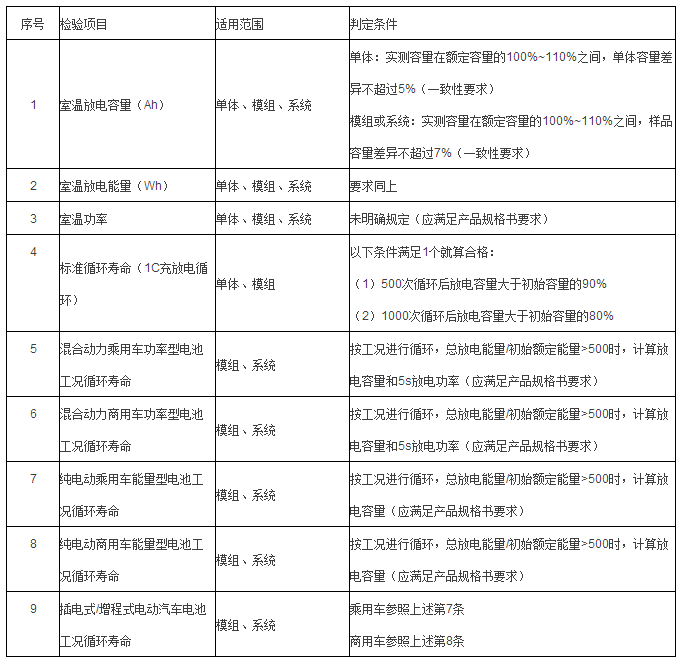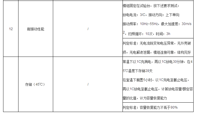具体的测试方法,详见标准文件,不在本文列出。标准中没有规定统一的判断依据,主要是因为到了动力电池系统这个层级,不同产品的指标差异较大,而每家企业的技术实力也不一样,所以量化的指标已经不取决于电池,而是取决于电池系统的综合性能(如电池性能,能量管理性能,热管理性能等)。基于此因素,检验项目的判断标准,应来自于产品规格书所规定的参数,满足产品的规格即为合格。