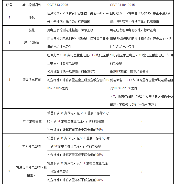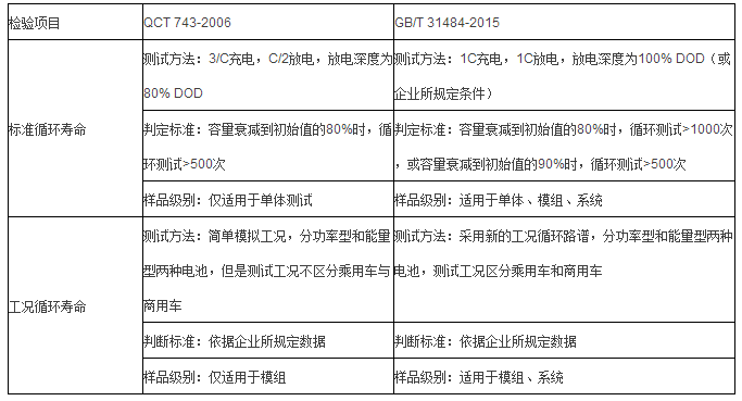 相比于QC/T 743-2006,GB/T 31484-2015在标准循环寿命和工况循环寿命的测试要求方面都更为严格,相关对比总结如下:
