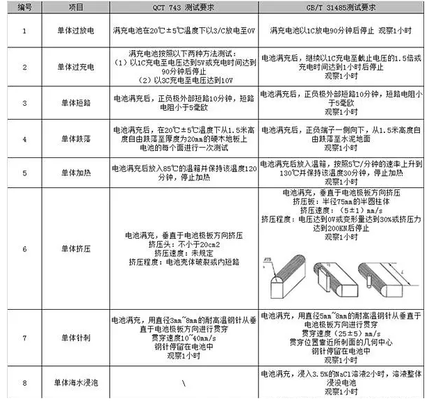 相比于QC/T 743-2006,GB/T 31485-2015增加了单体海水浸泡、单体温度循环、单体低气压、模组跌落、模组海水浸泡、模组温度循环、模组低气压等7项新的检验要求。针对大部分检验项目,GB/T 31485-2015均做了提高或强化,并要求测试结束后,必须观察1小时,才能确定检验是否合格,而QC/T743标准并无此要求。相关测试项目的对比如下: