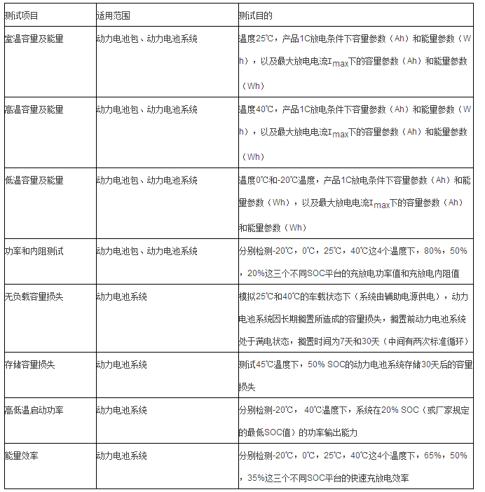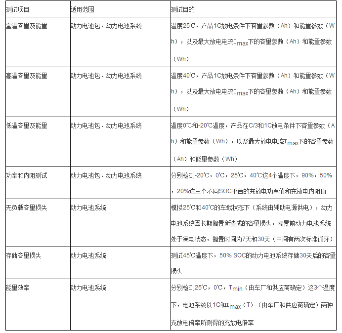 能量型电池主要应用于纯电动汽车和插电式/增程式混合动力车,作为车辆的唯一动力来源或重要动力来源,具有良好的节能和减排效果。能量型动力电池系统要求存储的能量多(比能量),高低温性能好,循环寿命好。针对能量型电池包/电池系统,标准提供了较为详细的测试规程,但是并没有提供判定合格的依据,具体的判断条件,取决于电池或整车企业提供的产品规格书所规定的数值。